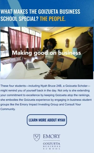 With the end of the fiscal year quickly approaching, the marketing team wanted one last campaign push. The request? Find inspiring students stories that haven’t been told to death. For the next week, I dived deep into social listening and found four students who fit the bill. We told their stories through bold storytelling, photography, and videography. The final produce was an interactive digital story that was promoted through a sophisticated email marketing strategy.